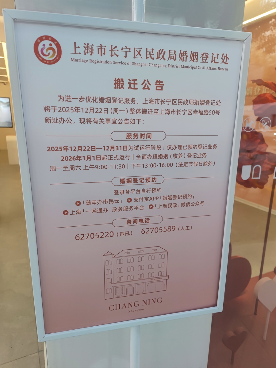 据悉,新址于12月22日至31日试运行,仅办理已预约登记业务;2026年1月1日起正式全面办理婚姻(收养)登记业务。原金钟路登记点12月19日至30日保留临时窗口,31日起停止办理。需要提醒的是,幸福路50号周边停车位紧张,建议市民绿色出行。