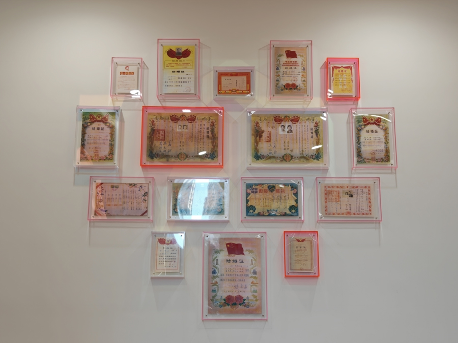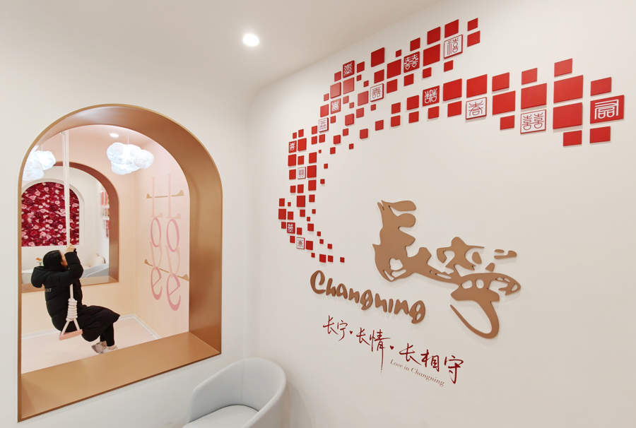 “原先金钟路的登记点打卡场景较为单一,难以满足新人拍摄纪念照片的多样化需求。”工作人员指着一楼的特色打卡区介绍,新址特意打造了三个主题空间,让领证仪式感从登记延伸到打卡。第一个空间的背景,是由不同字体“喜”字组成的长宁区Logo,寓意“长宁·长情·长相守”,不少提前探营的新人已在这里定格甜蜜瞬间;第二个空间,云朵吊灯与粉色秋千既满足了年轻人的浪漫想象,又提供了互动拍摄的趣味场景;第三个空间,是颇具年代感的婚俗文化展示区,16张上海不同时期的老式结婚证书拼成爱心形状,泛黄的纸张上记录着不同年代的爱情模样。“我们还与上服集团合作,在这里展示各式特色婚俗服饰,让新人感受传统婚俗的魅力。”工作人员补充道。