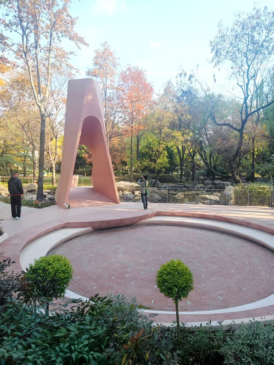 从婚登大楼向右步行约一分钟,便进入了华山绿地公园的“幸福转角”。入口处,圆润的“心的甜甜圈”象征圆满,中心镂空成爱心形状,鼓励新人在两侧牵手互动,也可透过心形框景,在台阶上定格美好瞬间;原来不起眼的木栈道,被打造成开放式景观坐阶。十二国语言镌刻的“幸福十二味”悄悄藏在台阶立面,新人俯身寻找专属誓言,仪式感拉满;作为空间核心的粉色清水混凝土拱桥弧度温柔,桥头仪式感塔白天是“告白地标”,夜晚亮起星光灯宛如“银河”为你打光,桥下圆形小广场寓意“长长久久”,可举办小型颁证仪式。