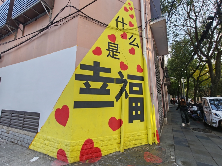 幸福路与华山路交叉口,“什么是幸福,幸福是什么”装置静静伫立,“幸福”二字各少了一“竖”,等待人们用自己的身影去填补。“最佳拍摄点在马路对面,能把装置和街景完美收录。”路过的张先生正带着家人拍照,他笑着说:“我和爱人站在中间,就构成了完整的‘幸福’,这个设计太有创意了,很适合记录家庭时光。”