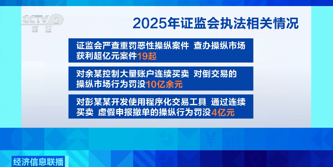 此外,2025年,证监会严查重罚恶性操纵案件,查办操纵市场获利超亿元案件19起。对余某控制大量账户连续买卖、对倒交易的操纵市场行为罚没10亿余元;对彭某某开发使用程序化交易工具,通过连续买卖、虚假申报撤单的操纵行为罚没4亿元。